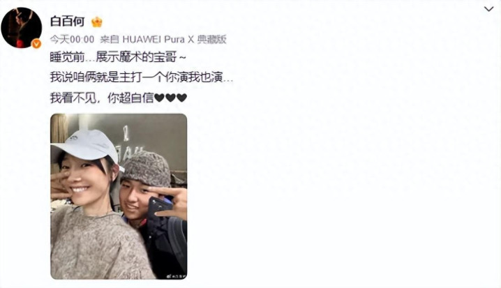 1月29日凌晨,演员白百何在社交平台发布与大儿子合照:“睡觉前…展示魔术的宝哥~我说咱俩就是主打一个你演我也演…我看不见,你超自信”